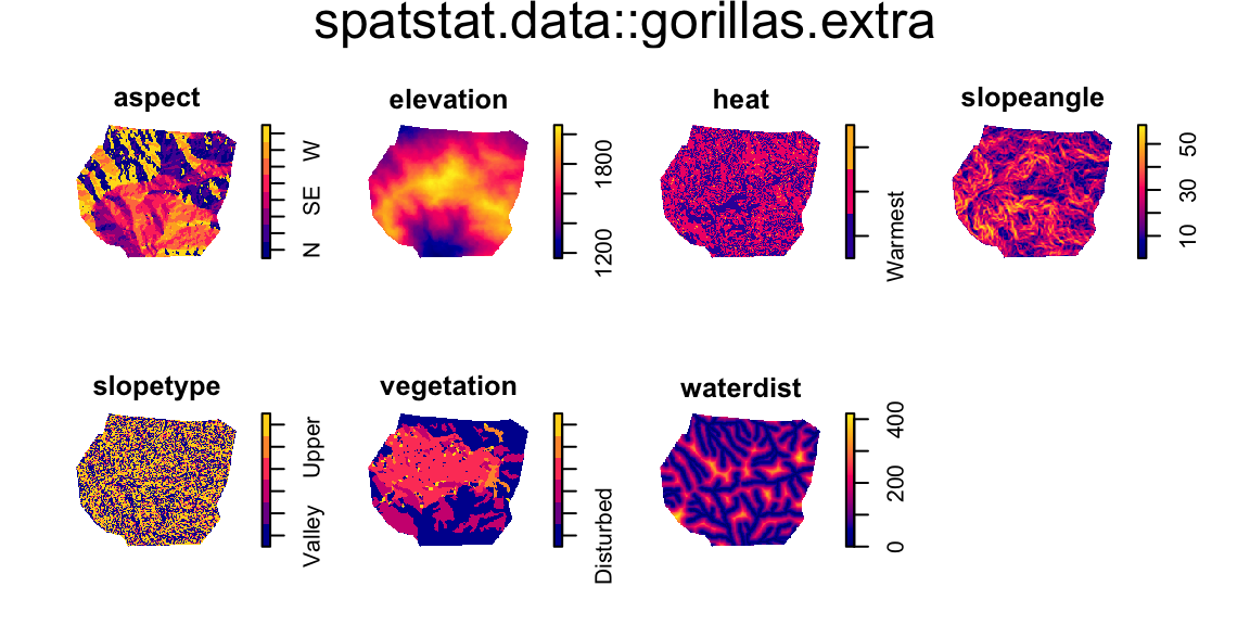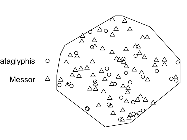 # [1] "vector"antsThe point-pattern (ppp.object, Chapter 27) ants from package spatstat.data (v3.1.9) has (Listing 10.8, Figure 10.2)