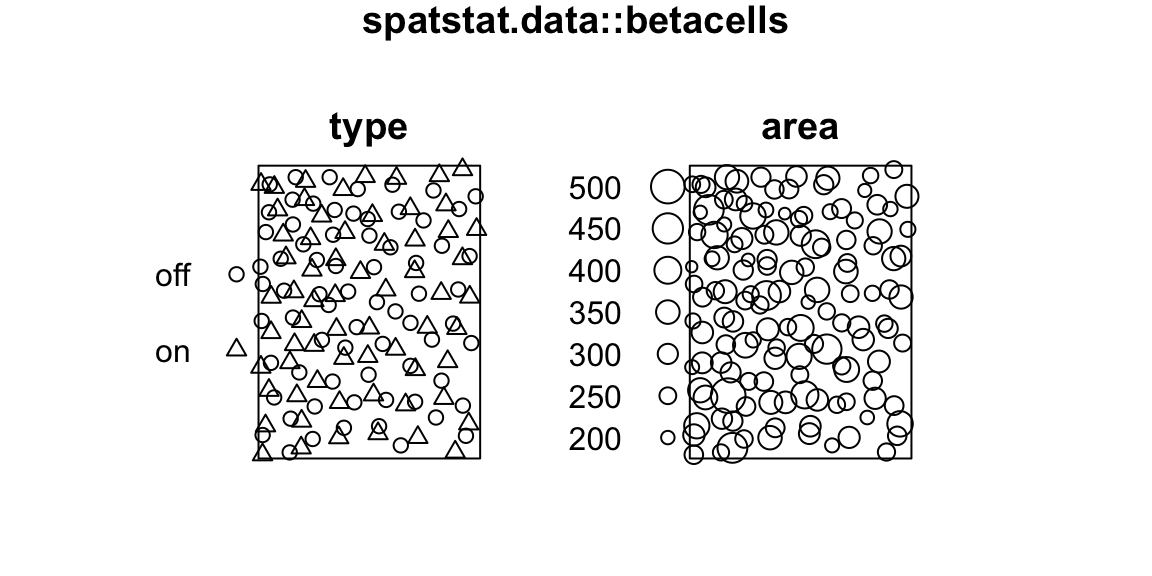 # enclosing rectangle: [144.63878, 148.34601] x [-43.59316, -40.58935] degreesbetacellsThe point-pattern (ppp.object, Chapter 27) betacells from package spatstat.data (v3.1.9) has (Listing 10.14, Figure 10.4)