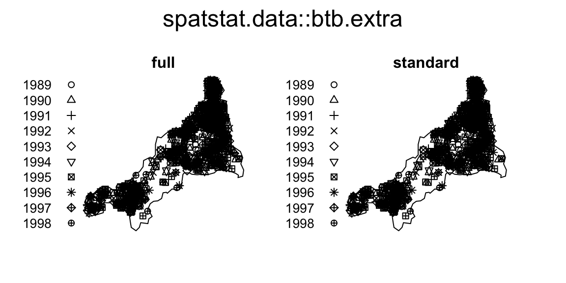 # window: rectangle = [0, 18] x [0, 7] mmbtb.extraThe point-pattern list (ppplist, Chapter 28) btb.extra from package spatstat.data (v3.1.9) (Listing 10.20, Figure 10.6)