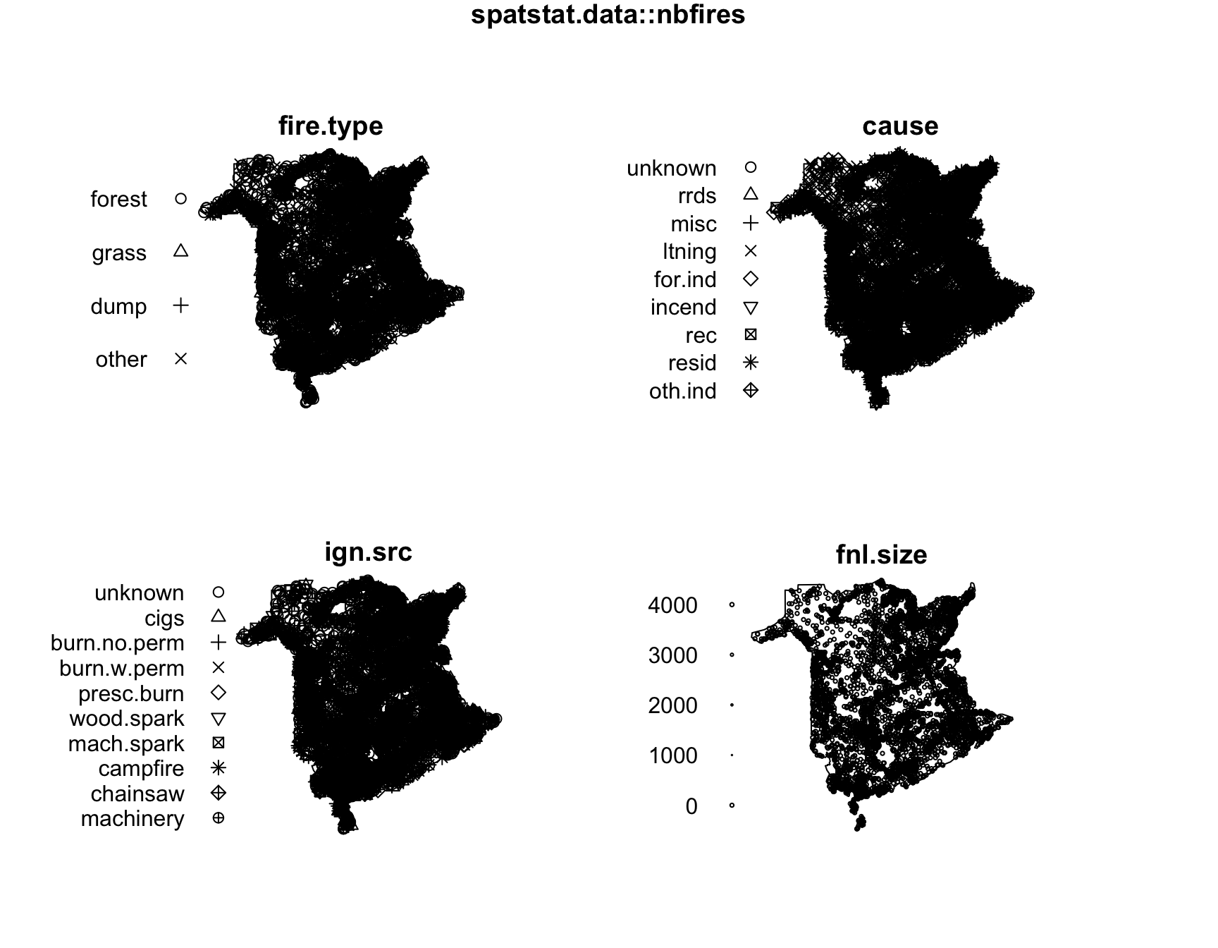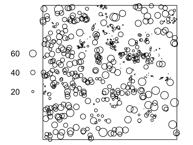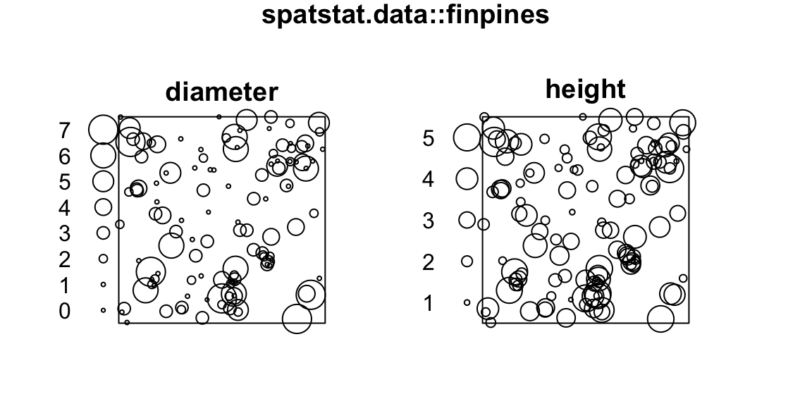 # [1] 40 5sprucesThe point-pattern (ppp.object, Chapter 27) spruces from package spatstat.data (v3.1.9) has (Listing 10.49, Figure 10.12)