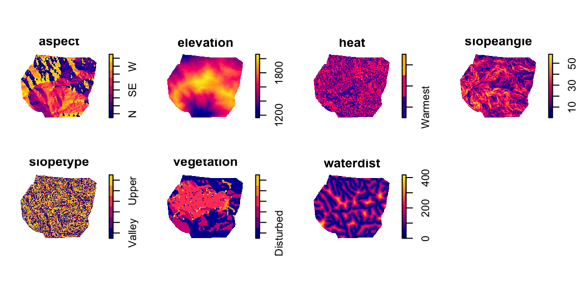 par(mar =c(0,0,1,0))spatstat.data::nbfires |> spatstat.geom::plot.ppp(which.marks =c('fire.type', 'cause', 'ign.src', 'fnl.size'))# Warning: Only 10 out of 16 symbols are shown in the symbol map