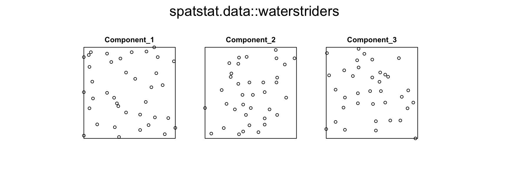 # [1] "owin"waterstridersThe point-pattern list (ppplist, Chapter 28) waterstriders from package spatstat.data (v3.1.9) (Listing 10.57, Figure 10.15)