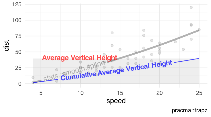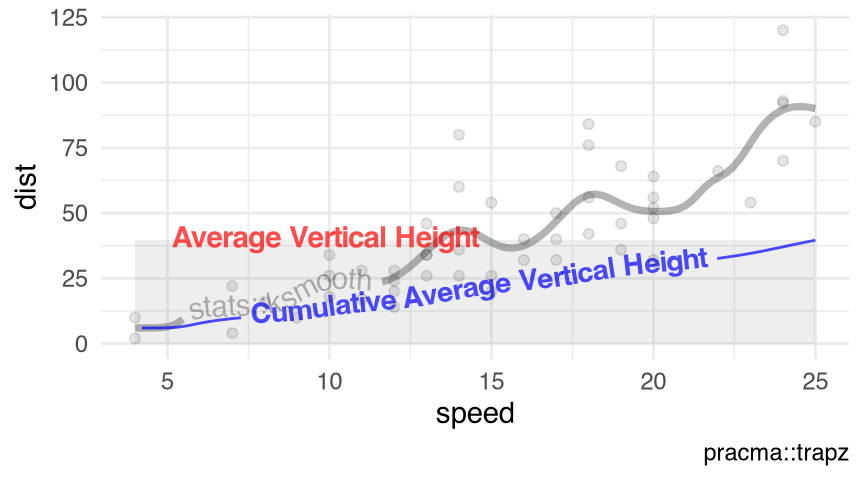- the \((i+1)\)-th element of \(i^{-1}(y_0/2+\sum_{k=1}^{i-1}y_k+y_i/2)\), if \(\{x_k;k=0,\cdots,i\}\) are equidistant, i.e., \(\forall k\in\{1,\cdots,i\}\), \(\Delta x_{k}\equiv \Delta x\). Note that the R does not use zero-based numbering; i.e., R