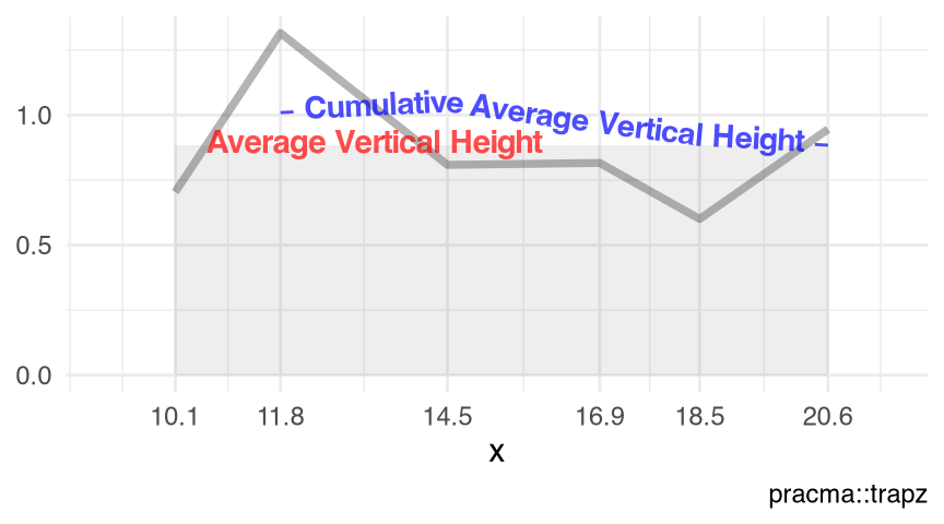 # [1] 0.7038865 1.3154339 0.8086511 0.8159990 0.6004716 0.9455408Note that the author intentionally makes the toy example data x not equidistant, as neither the chained trapezoidal rule framework nor the functions pracma::trapz() and pracma::cumtrapz() (Borchers 2025, v2.4.6) require the equidistant assumption.