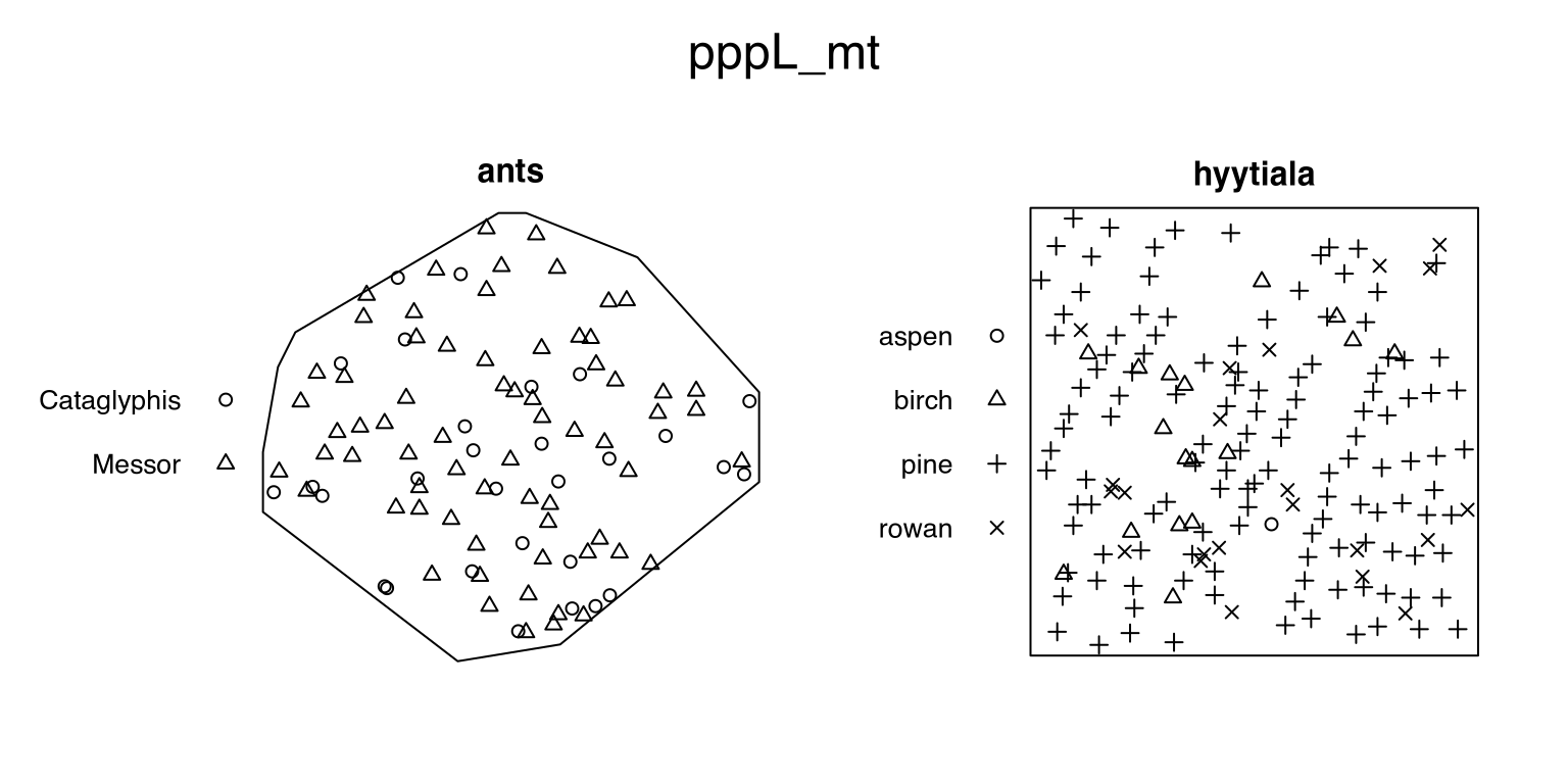 Listing 37.4 creates a point-pattern-list pppL_mt that contains the point-patterns ants (Section 10.2) and hyytiala (Section 10.13), both with one multi-type mark.