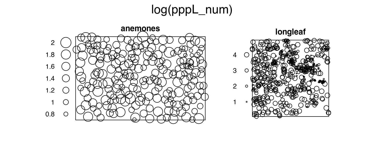 Listing 37.2 creates a point-pattern-list pppL_num that contains the point-patterns anemones (Section 10.1) and longleaf (Section 10.15), both with one numeric mark.