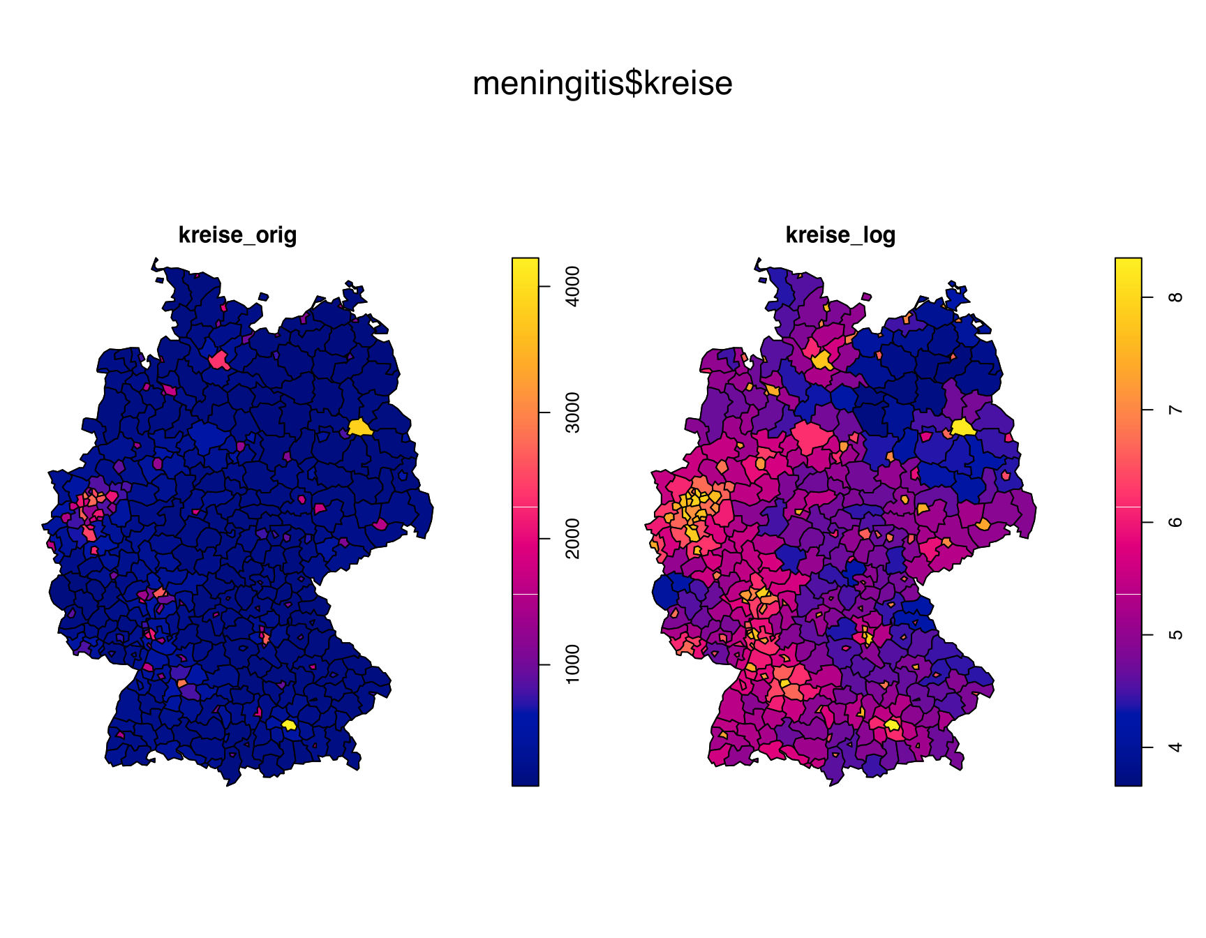 Listing 41.3 applies the log-transformation on the numeric marks of the tessellation meningitis$kreise (Section 10.16), and plots the original and log-transformed tessellations side-by-side for comparison (Figure 41.1).